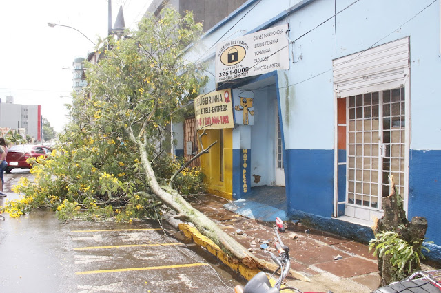 Na Rua Benjamin Constant, caíram duas árvores. Uma em frente a tele-entrega Ligeirinha, que também atingiu a rede elétrica e algumas motos, e outra maior localizada na calçada do Banco do Brasil, que interrompeu o trânsito.