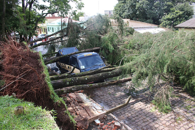 Na Rua Pinheiro Machado, o trânsito também foi interrompido. Caíram duas árvores, uma em cima de um veículo. Há poucos metros dali, na Rua Dr. Rivota, árvores localizadas no pátio do Hospital Militar caíram em cima de uma van escolar.