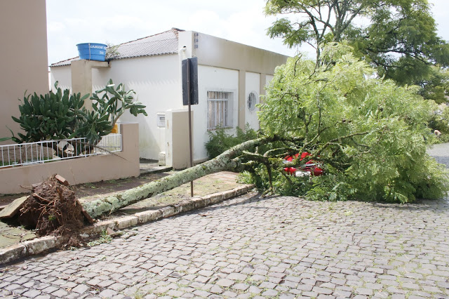 Na Rua Pinheiro Machado, o trânsito também foi interrompido. Caíram duas árvores, uma em cima de um veículo. Há poucos metros dali, na Rua Dr. Rivota, árvores localizadas no pátio do Hospital Militar caíram em cima de uma van escolar.